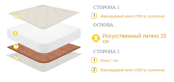 Беспружинная невысокая модель из натурального латекса и кокоса. Несмотря на высоту 12 см, способен выдерживать солидные нагрузки. Стороны: жесткая/средняя.